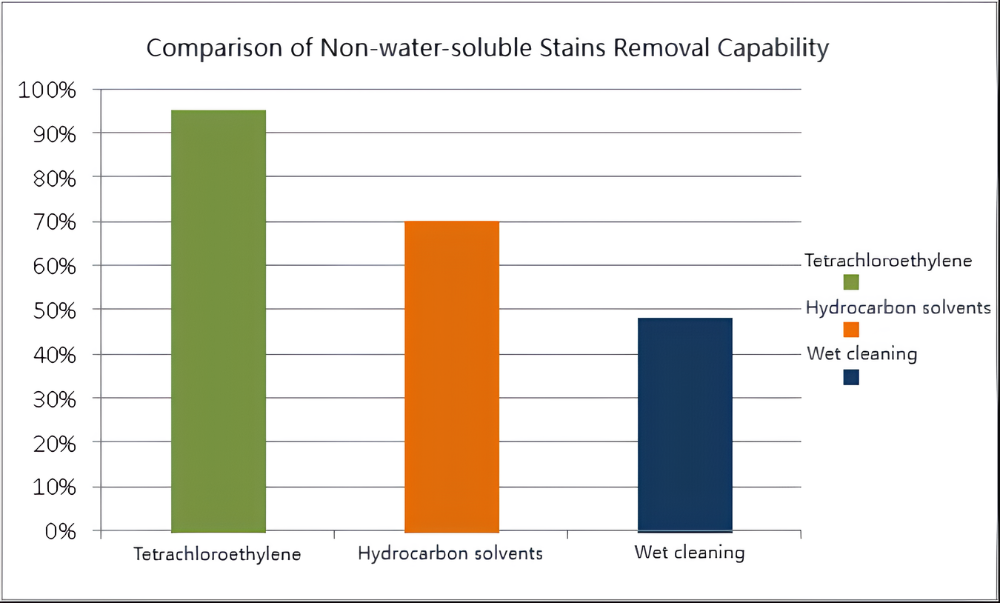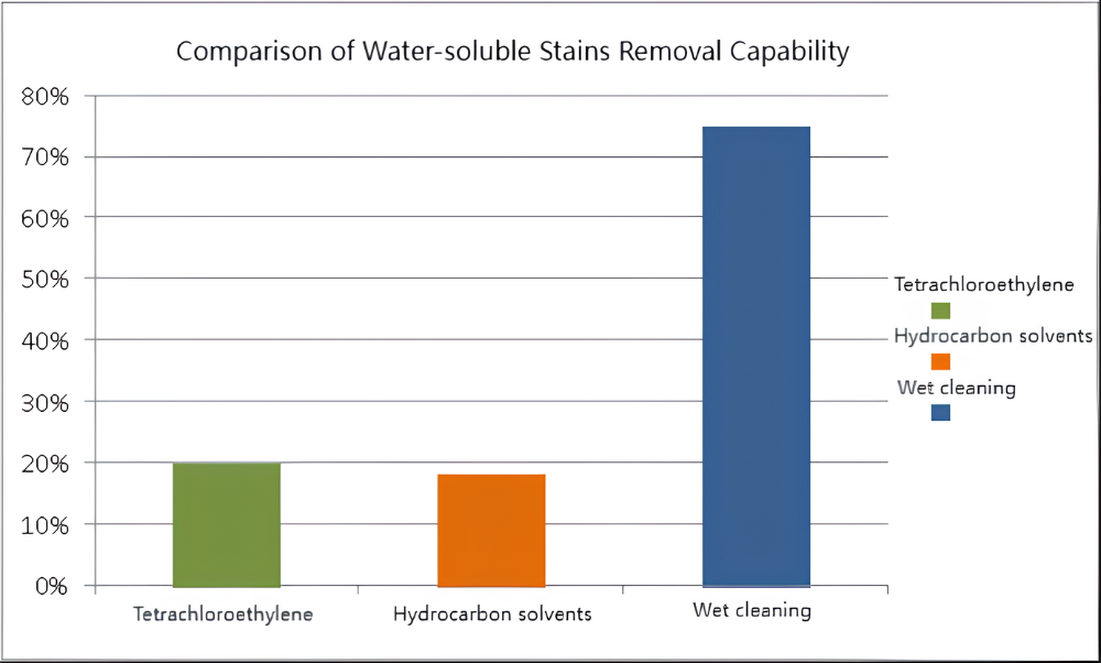 يتمتع التنظيف الرطب بالقدرة الأقوى على إزالة البقع القابلة للذوبان في الماء، والتي قد تصل إلى 75%، يليه رباعي كلور الإيثيلين والمذيبات الهيدروكربونية.