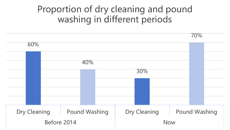 في السنوات الأخيرة، وخاصة بعد عصر الوباء، تغيرت نماذج العمل كثيرًا. يعمل الكثير من الناس من المنزل ويقل سعيهم وراء الملابس. بالإضافة إلى ذلك، تحول نمط استهلاك الملابس إلى الملابس الخفيفة والرياضية، لذلك استمرت أعمال التنظيف الجاف في الانخفاض بسبب التغيرات المادية، وتغير المناخ، ودعوة المجتمع القوية لحماية البيئة.